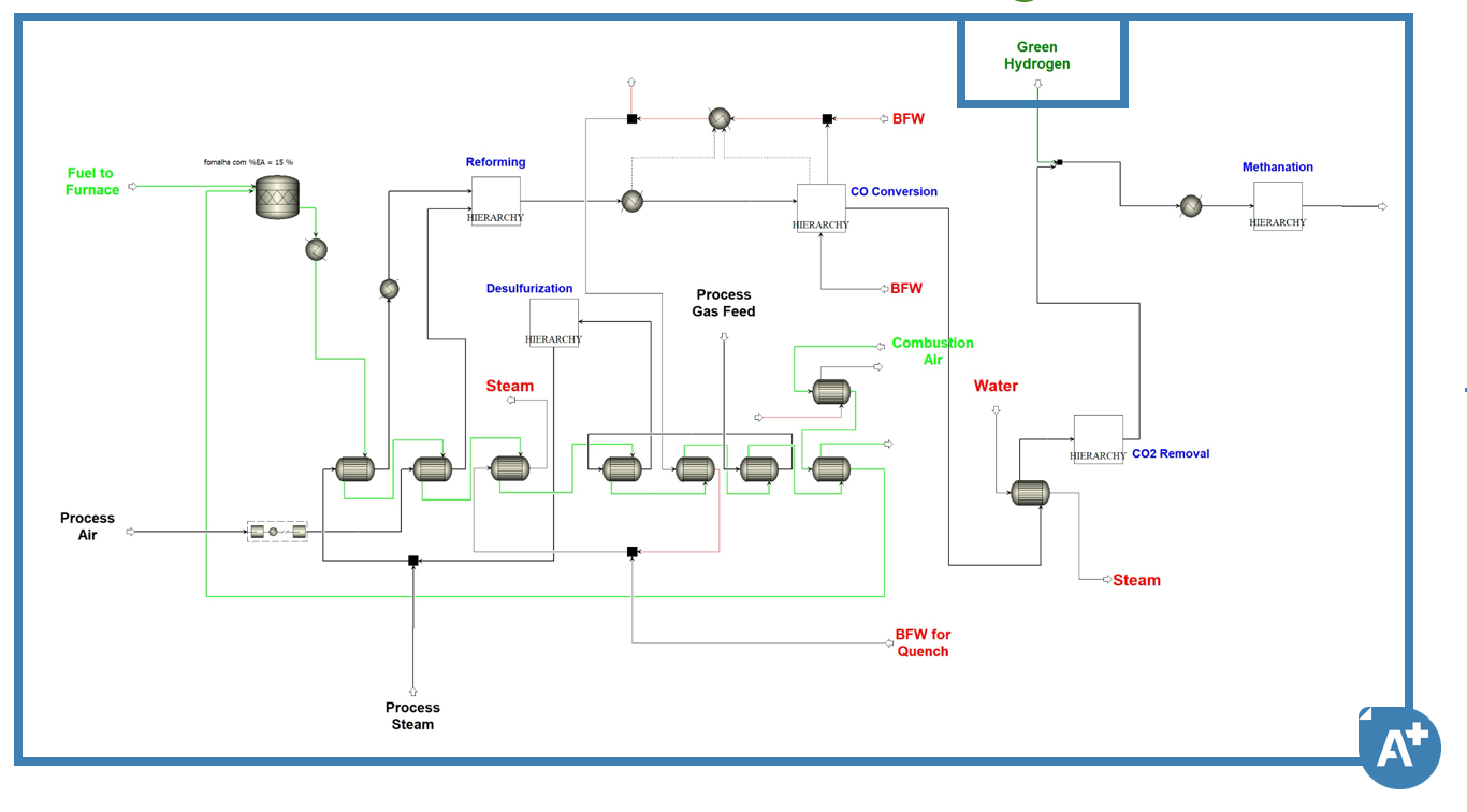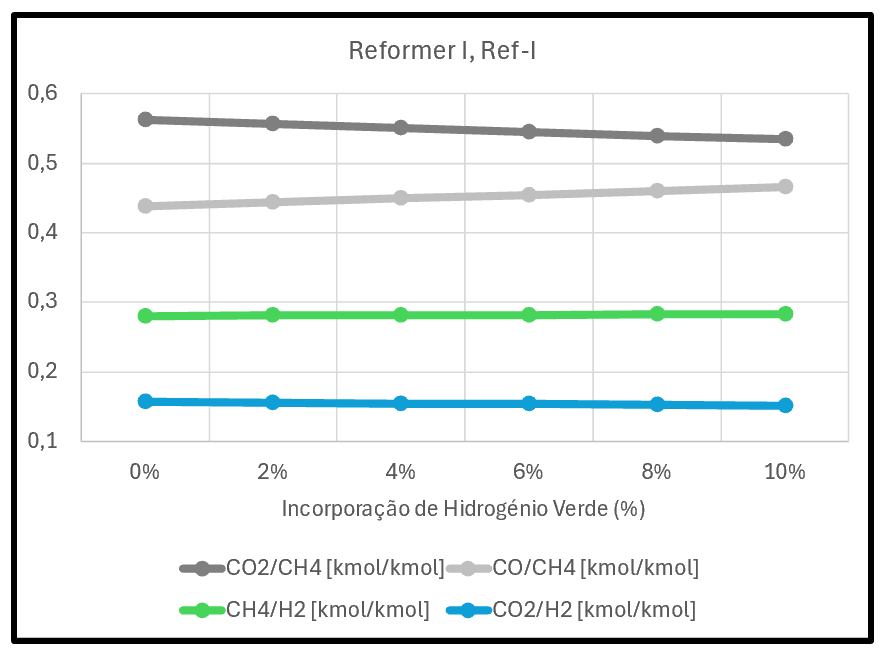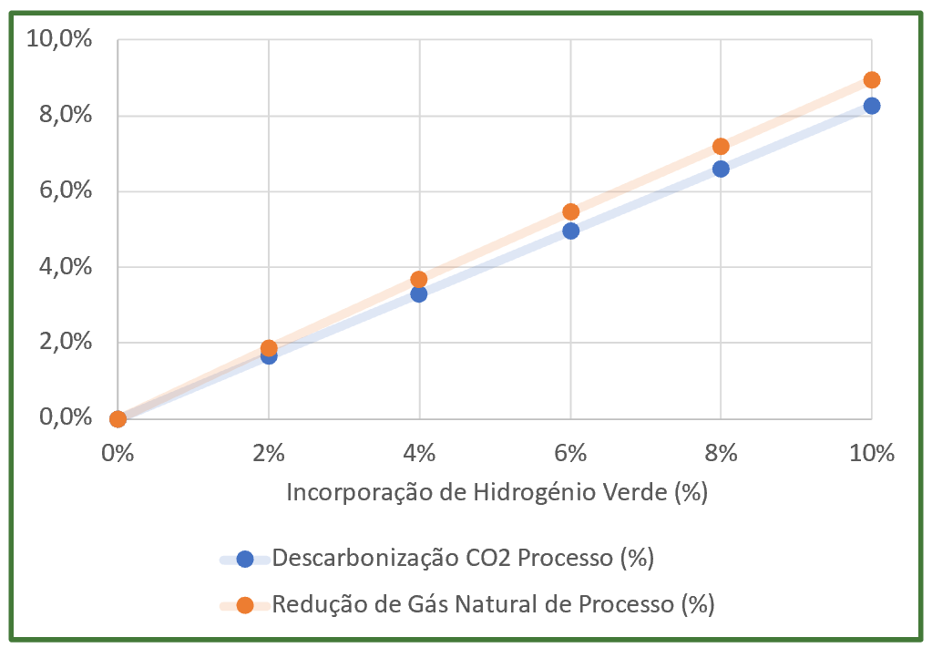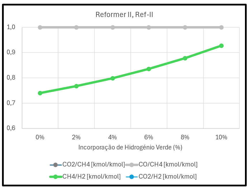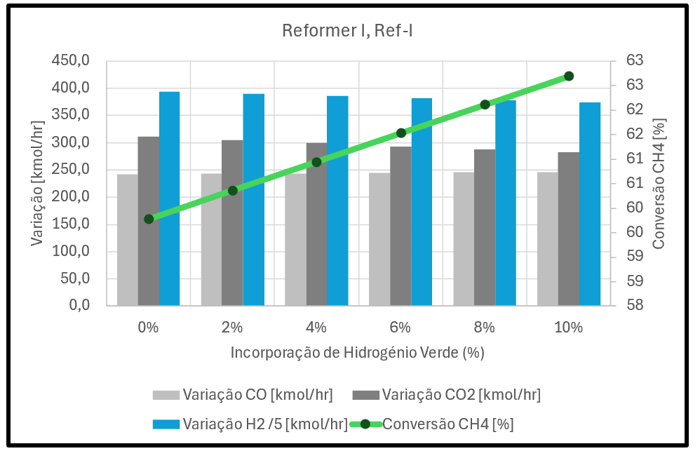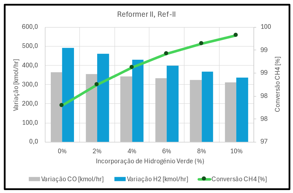 ▼ Redução do Gás Natural de Processo⇶ Igual caudal de ar (igual oxigénio)▲ Maior extensão da oxidação do CH4▲ Mais CO2 libertado por H2 produzido | ![]() |